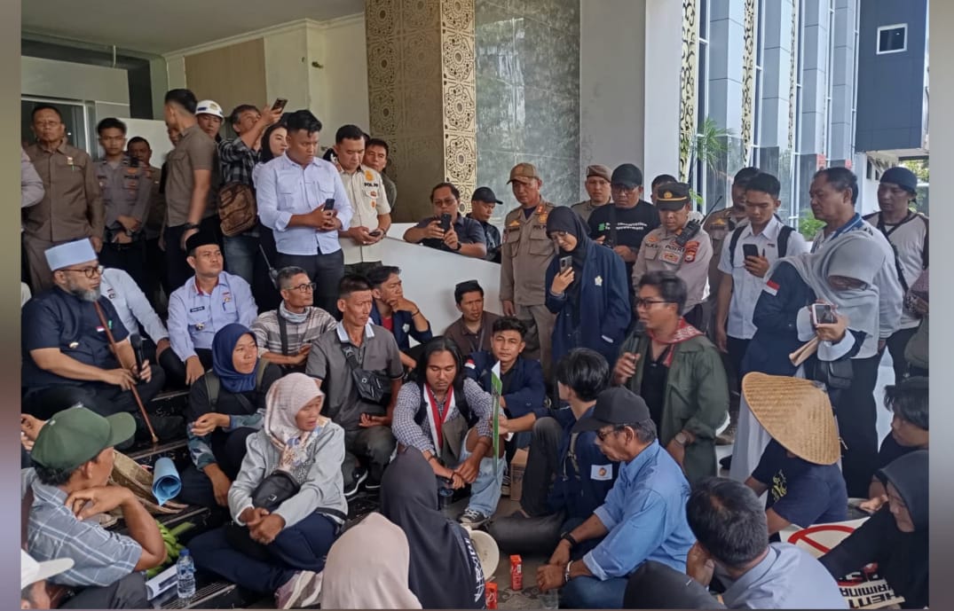 WALHI Bersama Organisasi Masyarakat Sipil, Kelompok Tani, Masyarakat Adat dan Gerakan Mahasiswa Saat Menyampaikan Tuntutan Kepada Gubernur Bengkulu, Helmi Hasan Dalam Aksi Memperingati HTN ke-65 di Kantor Gubernur. Rabu, 24 September 2025. Foto/Dok: Istimewa
