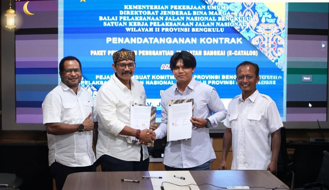 Penandatanganan kontrak pekerjaan telah dilakukan pada Senin (23/2/2026) antara PPK 2.3 Satker PJN Wilayah II Bengkulu dengan kontraktor pelaksana, CV. JS Brother. Paket pekerjaan penggantian jembatan sepanjang 16,60 meter ini dilaksanakan menggunakan skema E-Catalog dan turut disaksikan Kepala BPJN Bengkulu, Dr. Zepnat Kambu, ST, MT.