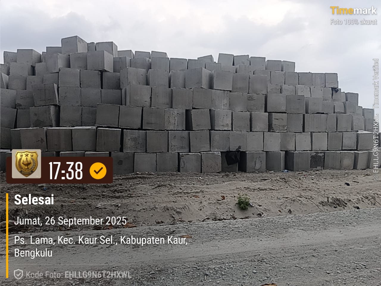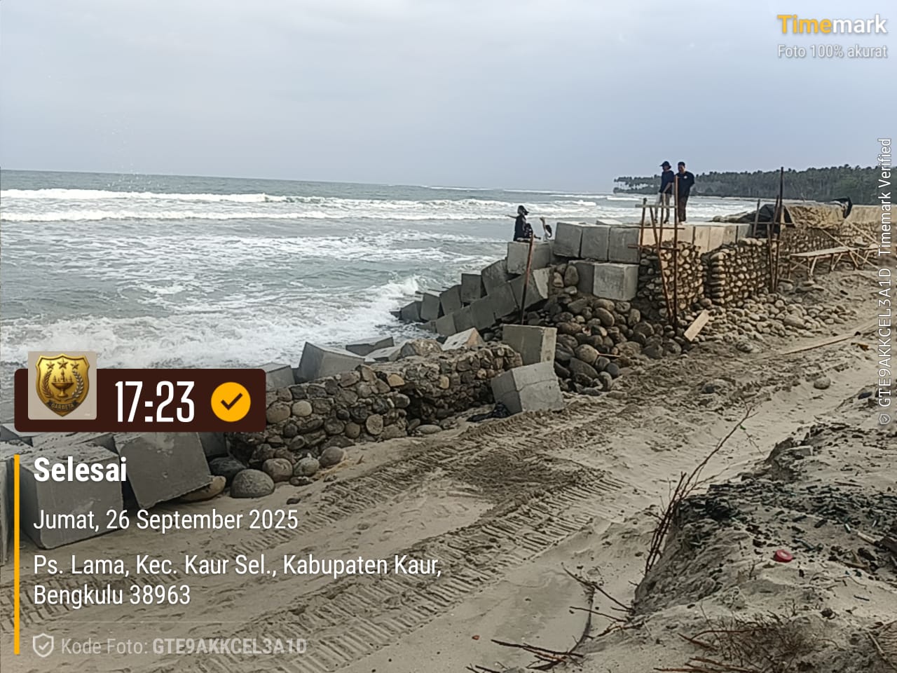 Foto Papan Merk dan Hasil Pekerjaan Proyek Pengaman Pantai Kritis dikabupaten Kaur yang Dikerjakan PT. Dua Satu Konstruksi Bengkulu Tahun Anggaran 2025. Dok: Ist- Garbeta